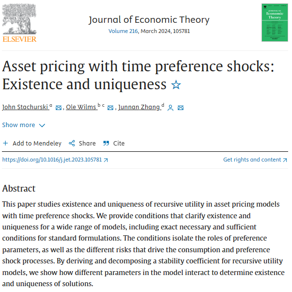 Recently, the paper "Asset pricing with time-preference shocks: Existence and uniqueness" co-authored by Junnan Zhang, an assistant professor of the Center for Macroeconomic Research, Paula and Gregory Chow Institute for Studies in Economics and the Wang Yanan Institute for Studies in Economics (WISE), Professor John Stachurski of the Australian National University (ANU), and Associate Professor Ole Wilms of Universität Hamburg and Tilburg University, has been published in the Volume 216, 2024 of Journal of Economic Theory, a top international journal of economic theory.