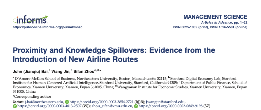 Recently, the paper “Proximity and Knowledge Spillovers: Evidence from the Introduction of New Airline Routes” co-authored by Sifan Zhou, an assistant professor of the Department of Public Finance, School of Economics and the Wang Yanan Institute for Studies in Economics (WISE), associate professor John Bai of Northeastern University, and researcher Wan Jin of Stanford University, has been published online in Management Science, a top journal of management.