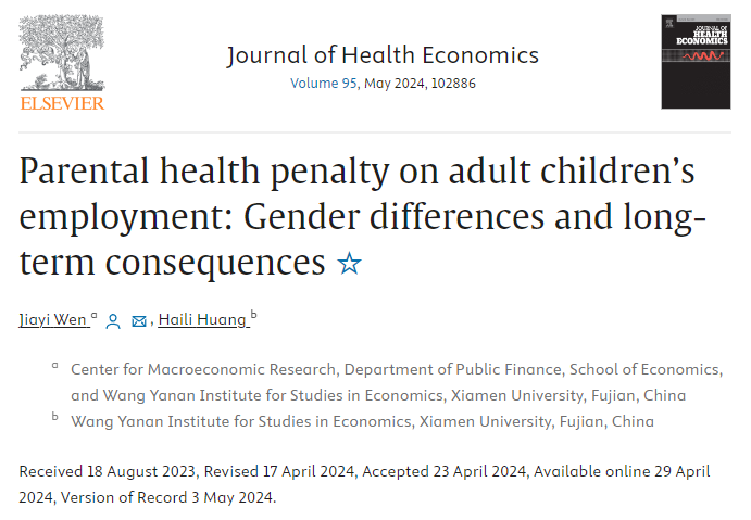 In recent days, a paper titled “Parental health penalty on adult children’s employment: Gender differences and long-term consequences” coauthored by Jiayi Wen, Assistant Professor of the Department of Public Finance, School of Economics and Wang Yanan Institute for Studies in Economics (WISE), and Haili Huang, a 2023 master’s graduate of WISE, has been published in the Journal of Health Economics, a top journal in the field of health economics. This journal falls into Category A within our own tiered journal ranking system by the College of Economics.
