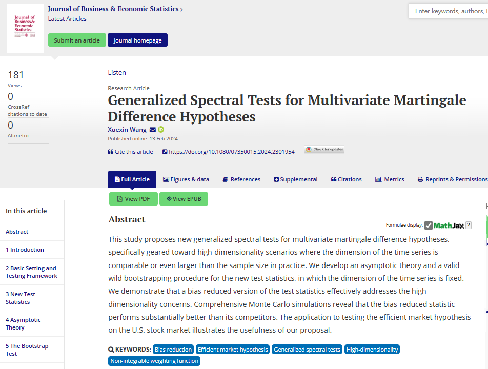 In recent days, a paper titled “Generalized Spectral Tests for Multivariate Martingale Difference Hypotheses” written independently by Associate Professor Xuexin Wang of the Wang Yanan Institute for Studies in Economics (WISE) and the Department of Statistics and Data Science, School of Economics, Xiamen University, has been published online in the Journal of Business & Economic Statistics, an authoritative international journal of statistics and econometrics.