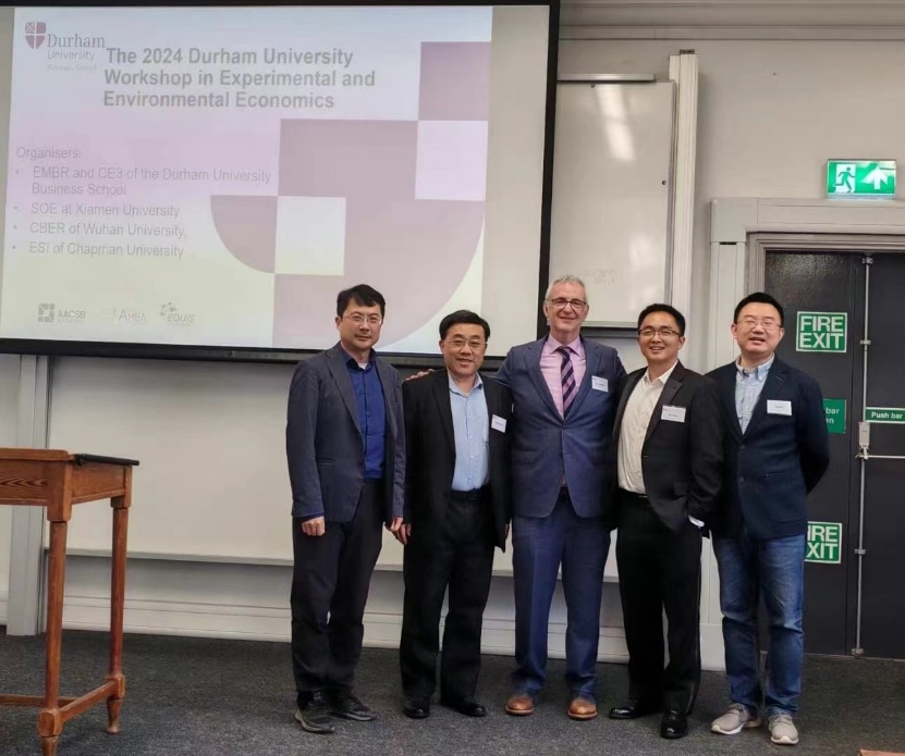 On June 18-19, the 2024 international workshop on Experimental and Environmental Economics, co-organized by Xiamen University (China), Durham University (UK), Wuhan University (China), and Chapman University (USA), was held at Durham University. Prof. Yinggang Zhou, Dean of the School of Economics and Wang Yannan Institute for Studies in Economics (WISE), Xiamen University, and Associate Prof. Sen Geng and Associate Prof. Zhi Li of the College of Economics, Xiamen University, participated in the workshop and reported their latest research results. This is the first time the College of Economics, Xiamen University has co-sponsored an international academic conference abroad after the Covid-19 pandemic.