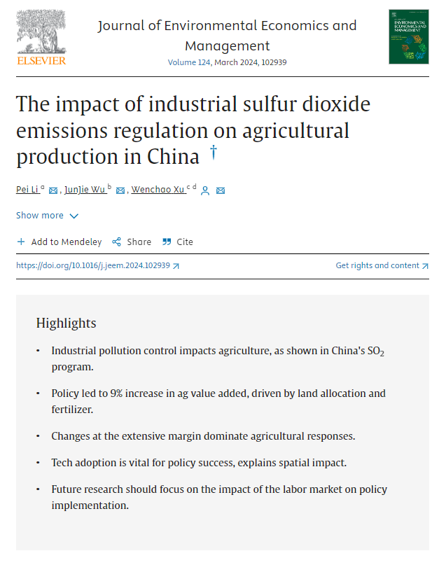 Recently, Associate Professor Wenchao Xu of the College of Economics, Xiamen University (XMU), in collaboration with Associate Professor Pei Li of Zhejiang University and Professor Junjie Wu of North Carolina State University, published a paper titled “The impact of industrial sulfur dioxide emissions regulation on agricultural production in China” in the Journal of Environmental Economics and Management, Volume 124, March 2024. The Journal of Environmental Economics and Management is recognized by academia as an authoritative journal in the field of environmental economics and applied economics, and falls into Class A within our own tiered journal ranking system by XMU College of Economics. The paper is part of the important achievements of the Basic Science Center for Econometric Modelling and Economic Policy Studies, National Natural Science Foundation of China.