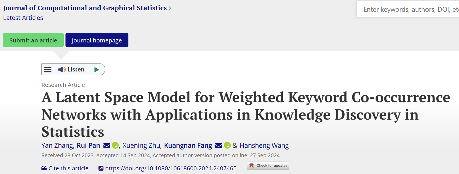 Recently, the paper “A Latent Space Model for Weighted Keyword Co-occurrence Networks with Applications in Knowledge Discovery in Statistics” has been published online in Journal of Computational and Graphical Statistics. The paper is a collaborative work of five authors: Yan Zhang, currently a PhD student in the Department of Statistics and Data Science, XMU School of Economics, Prof. Kuangnan Fang, Yan Zhang’s supervisor, Prof. Rui Pan of the Central University of Finance and Economics, Prof. Xuening Zhu of Fudan University, and Prof. Hansheng Wang of Peking University. Journal of Computational and Graphical Statistics is recognized as an international authoritative journal in statistics and falls into Category A- within our own tiered journal ranking system by XMU College of Economics.