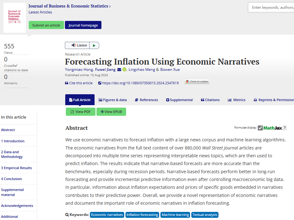 Recently, a paper titled “Forecasting Inflation Using Economic Narratives” has been published in the Journal of Business & Economic Statistics, a leading international journal of statistics and econometrics. The paper is jointly authored by Prof. Fuwei Jiang from the School of Economics and Wang Yanan Institute for Studies in Economics (WISE), Xiamen University (XMU), Prof. Yongmiao Hong from the School of Economics and Management, University of Chinese Academy of Sciences (UCAS), Lecturer Lingchao Meng from the China School of Banking and Finance, University of International Business and Economics, and Ph.D. candidate Bowen Xue from UCAS School of Economics and Management.