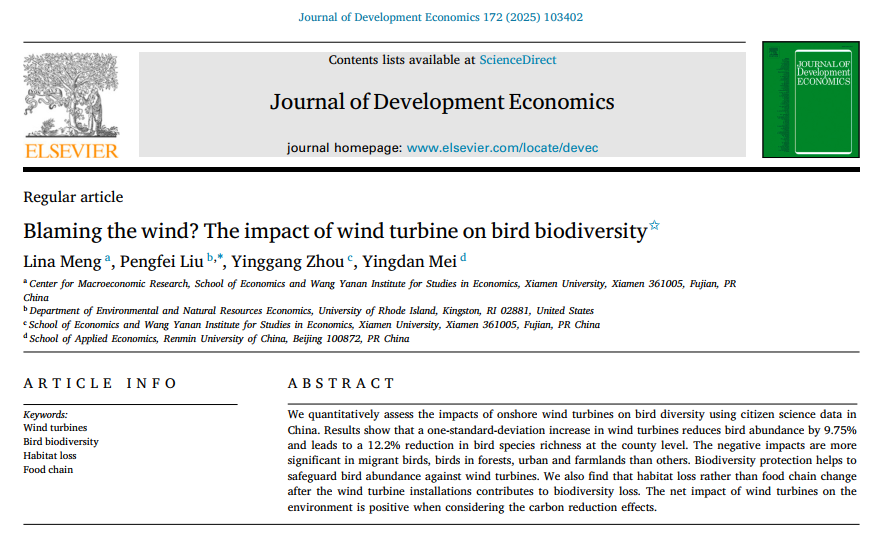 In recent days, Associate Professor Lina Meng and Professor Yinggang Zhou from XMU College of Economics, in collaboration with Associate Professor Pengfei Liu from the University of Rhode Island and Associate Professor Yingdan Mei from Renmin University of China, have published a paper entitled “Blaming the wind? The impact of wind turbine on bird biodiversity” in the Journal of Development Economics, a top international journal of development economics, which is recognized as an international Class A journal by XMU College of Economics. This paper is part of achievements of the Basic Science Center for Econometric Modelling and Economic Policy Studies, National Natural Science Foundation of China.