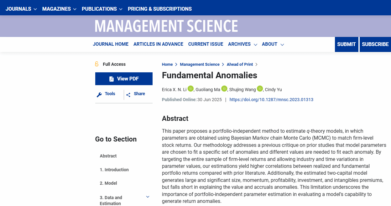 A paper titled “Fundamental Anomalies” has recently been published online in Management Science, a top international journal in the field of management. The paper is co-authored by Assistant Professor Guoliang Ma of Xiamen University, Professor Erica X. N. Li of Cheung Kong Graduate School of Business, Professor Shujing Wang of Tongji University, and Professor Cindy Yu of Iowa State University.